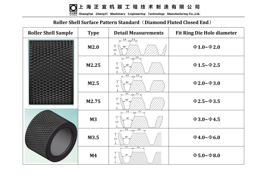 In order to facilitate customers to choose the most suitable surface for crushing roller shell, Shanghai Zhengyi has formulated the “Surface Texture Standard of the Roller Shell”, which specifies all the surface texture forms of Zhengyi’s roller shell products, as well as the range and size of each texture and its use and the aperture range of the ring die.
